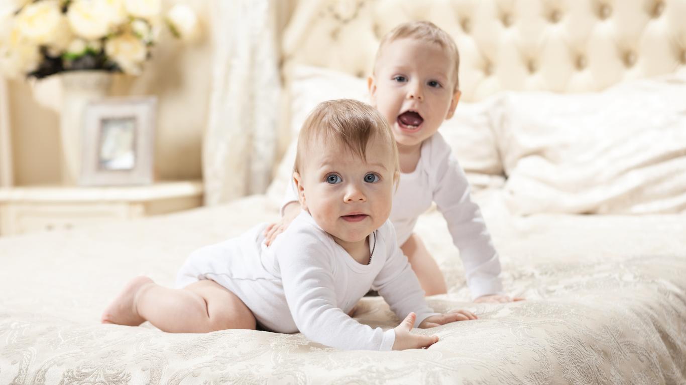 Обои Два забавных младенца лежат на кровати