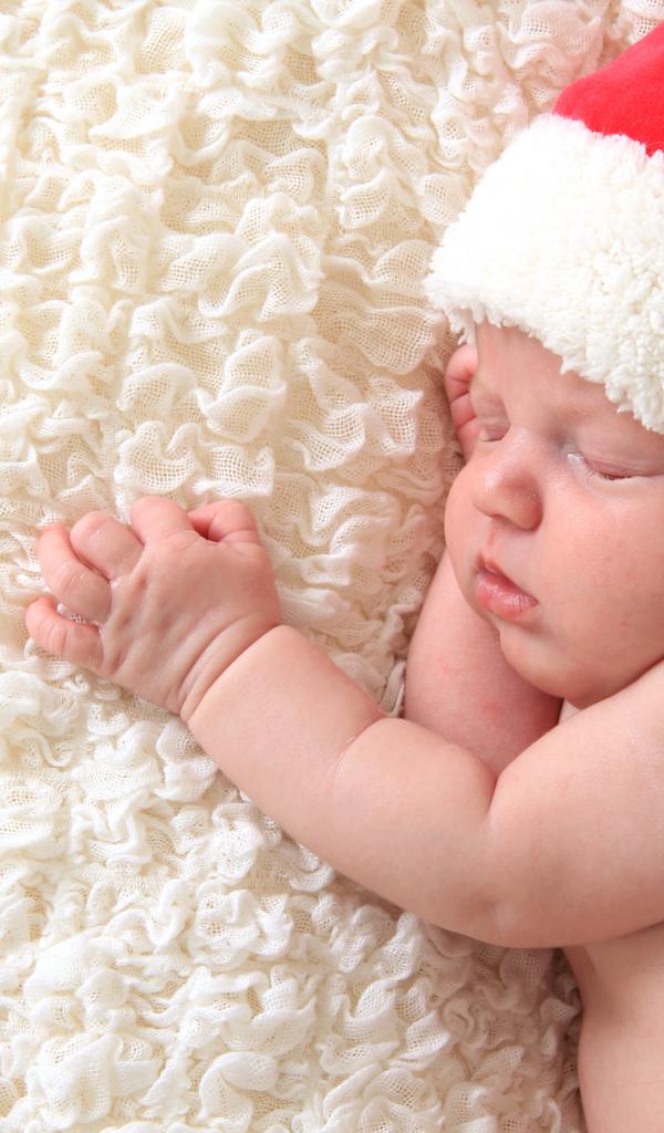 Обои Маленький спящий ребенок в красном новогоднем колпаке