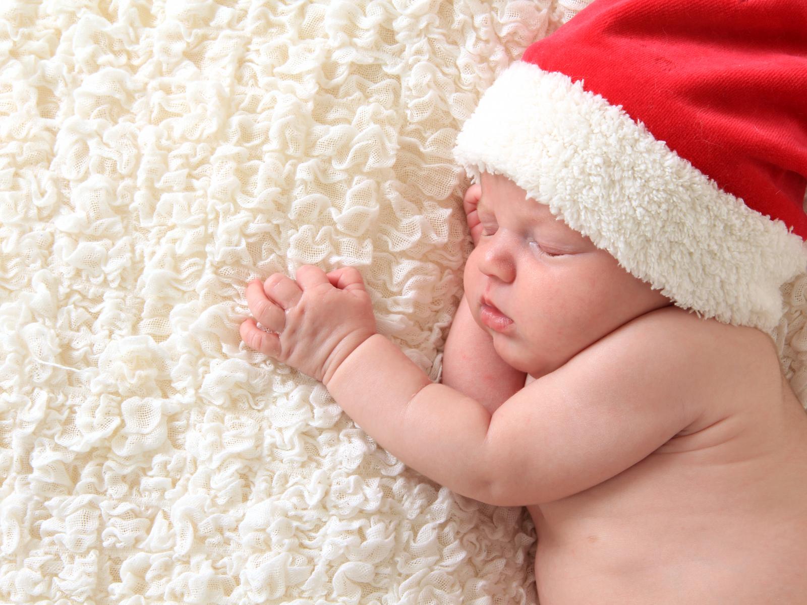 Обои Маленький спящий ребенок в красном новогоднем колпаке