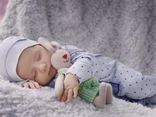 Обои Спящий младенец с игрушкой на сером фоне