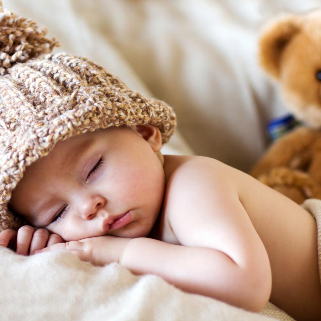Обои Спящий грудной ребенок в шапке с плюшевым мишкой