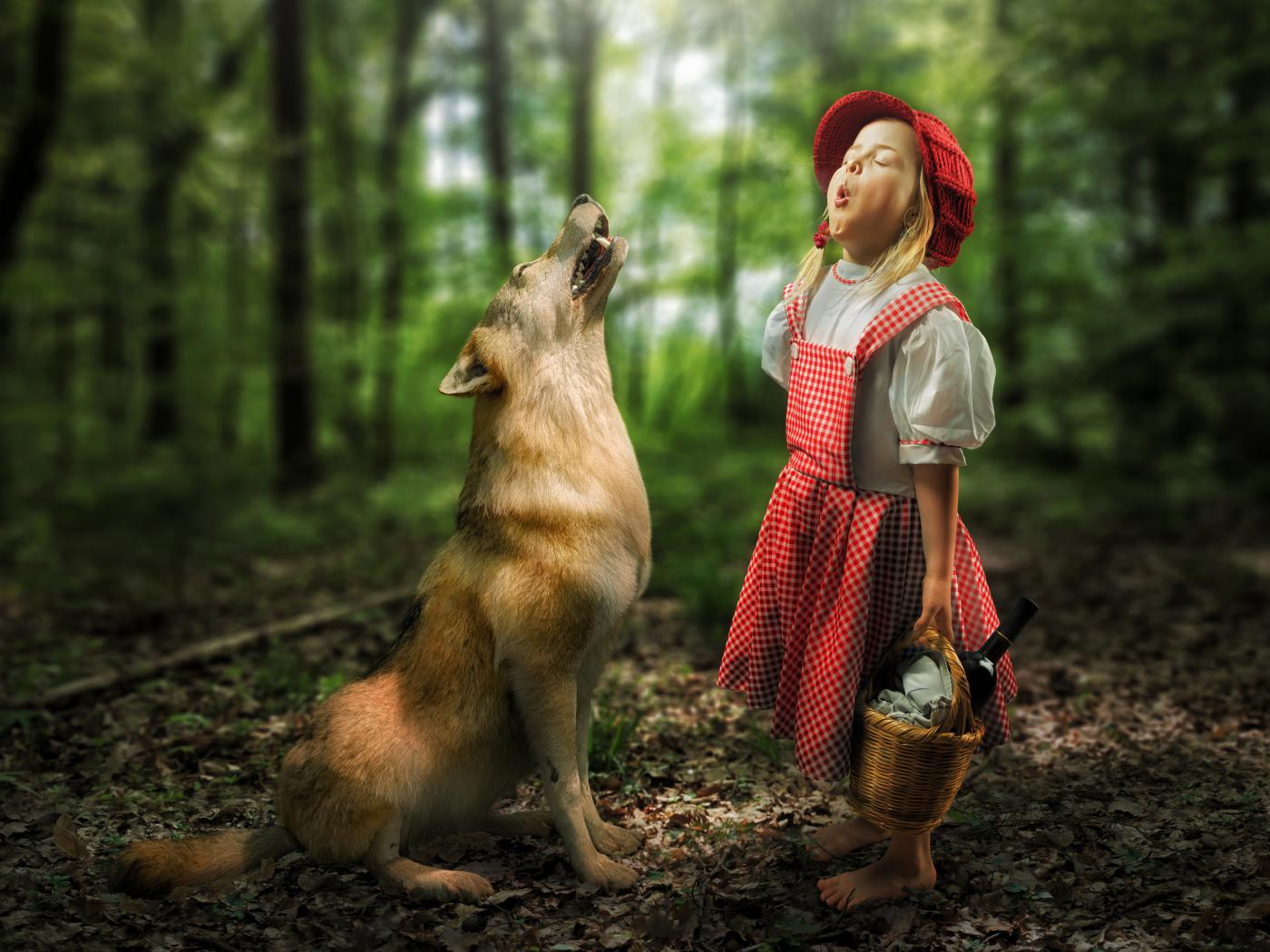 Обои Маленькая девочка в костюме красной шапочки с волком в лесу