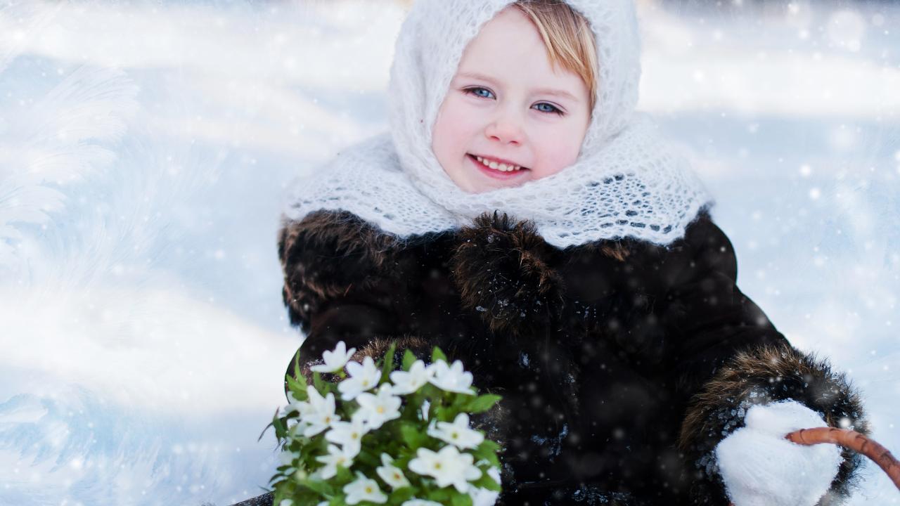 Обои Маленькая голубоглазая девочка с букетом подснежников зимой