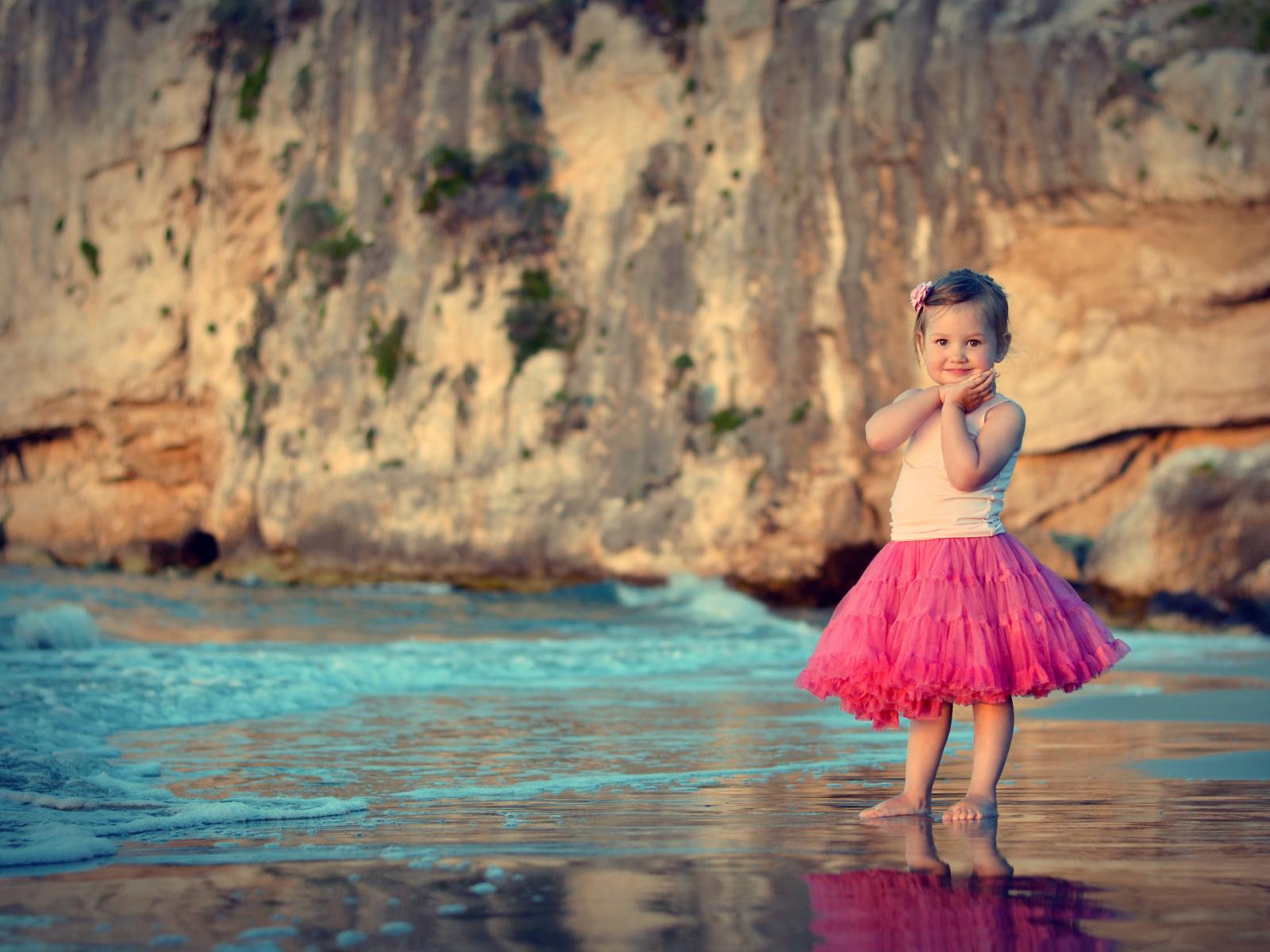Обои Маленькая девочка в красивой розовой юбке на пляже