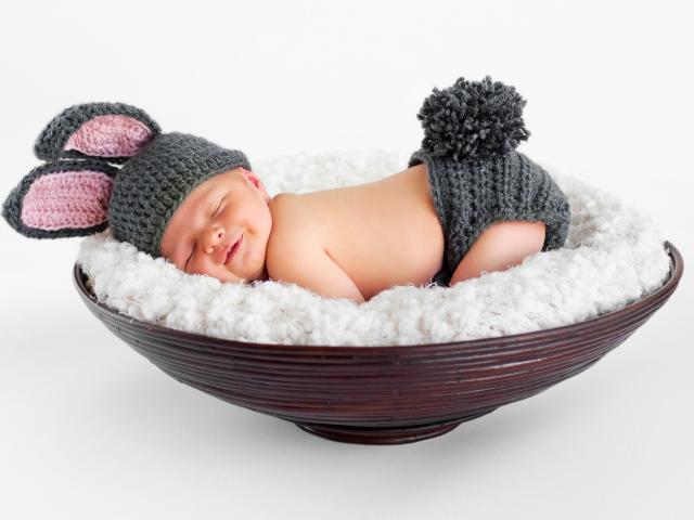 Обои Маленький спящий грудной ребенок в вязаном костюме зайчика