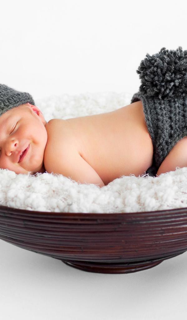 Обои Маленький спящий грудной ребенок в вязаном костюме зайчика