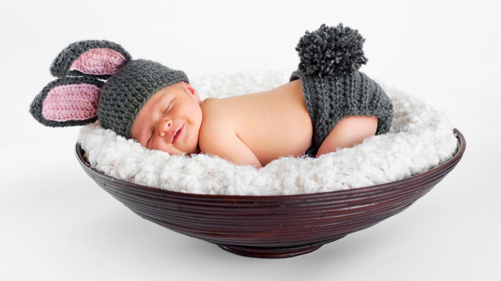 Обои Маленький спящий грудной ребенок в вязаном костюме зайчика