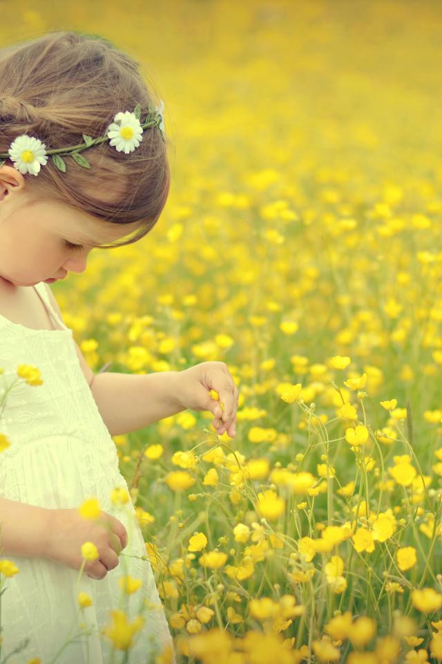 Обои Маленькая девочка в белом платье на лугу с желтыми цветами