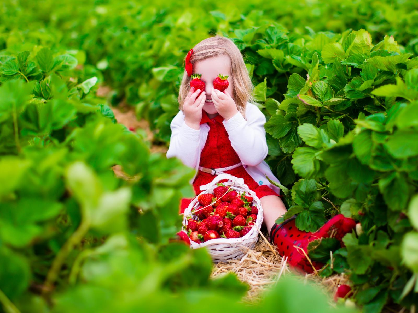 Обои Маленькая девочка сидит на грядке с красной клубникой