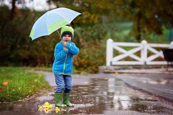 Обои Маленький мальчик под зонтом гуляет по лужам