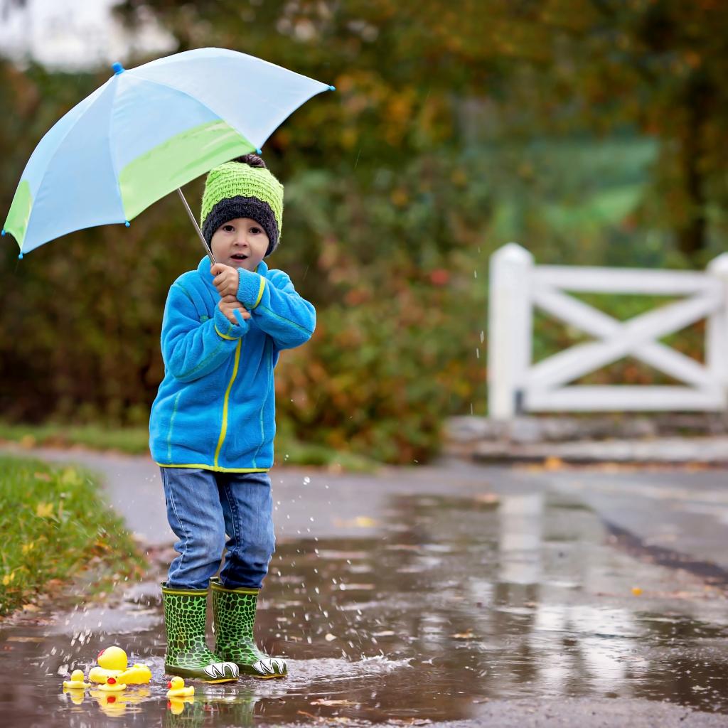 Обои Маленький мальчик под зонтом гуляет по лужам