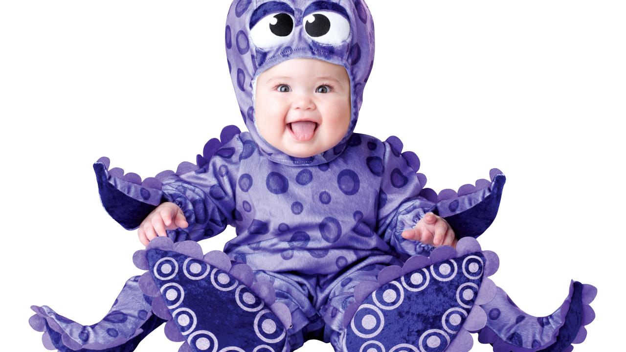Обои Маленький улыбающийся малыш в забавном костюме