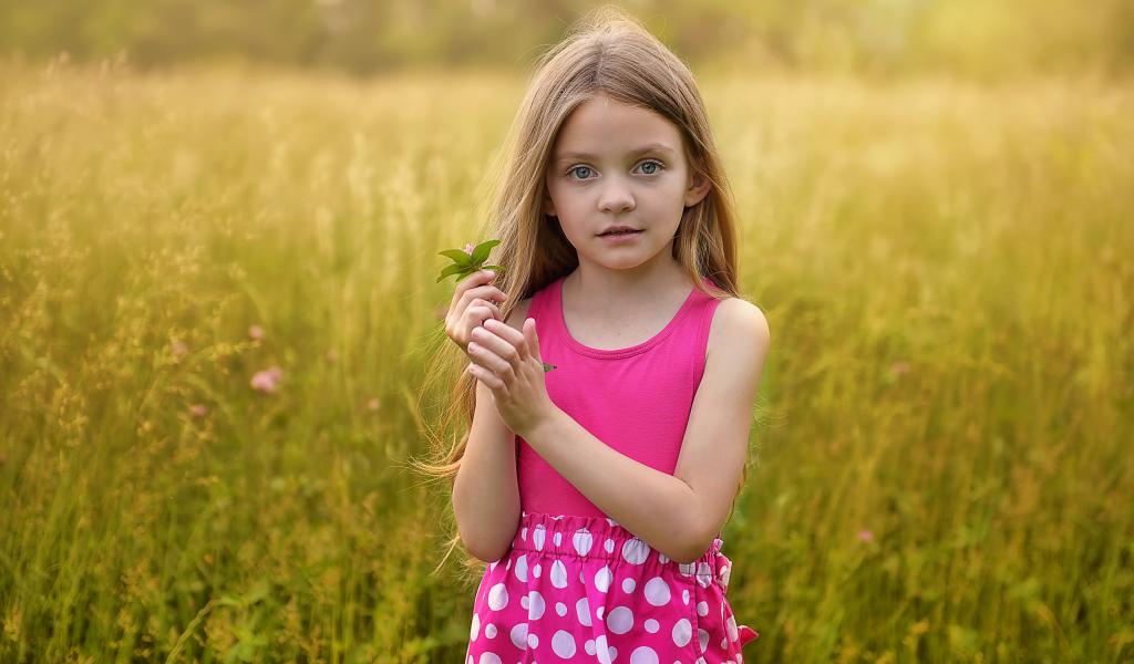 Обои Маленькая длинноволосая девочка в розовом сарафане на поле