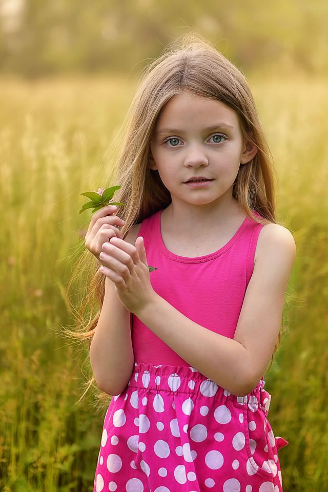 Обои Маленькая длинноволосая девочка в розовом сарафане на поле