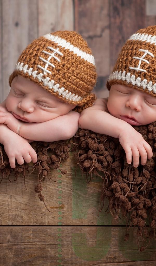 Обои Два милых спящих малыша в забавных вязаных шапках