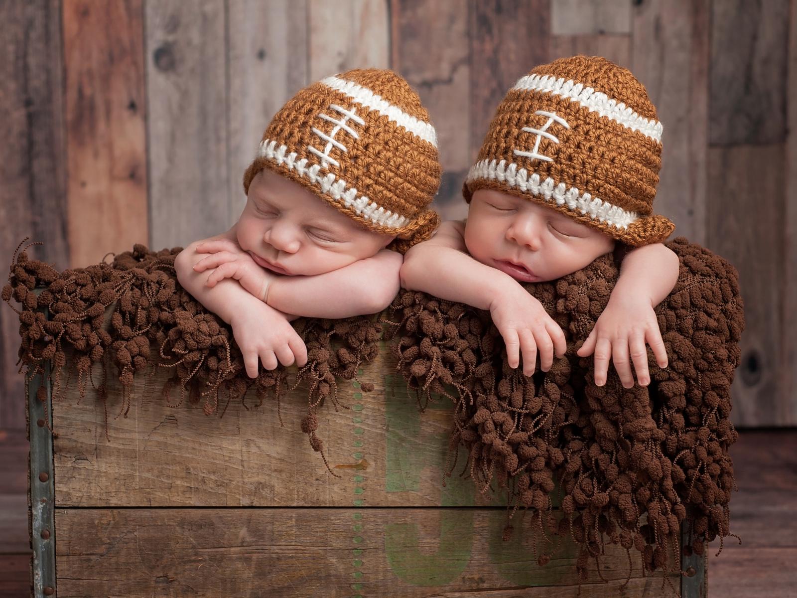 Обои Два милых спящих малыша в забавных вязаных шапках