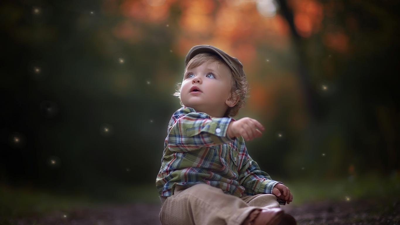 Обои Маленький милый мальчик сидит в кепке на дороге