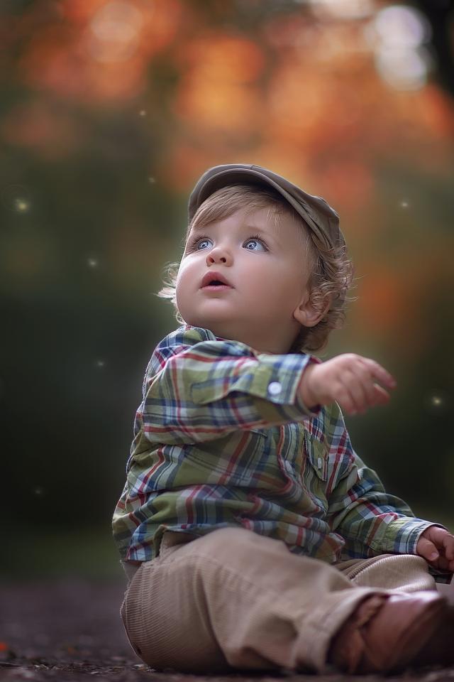 Обои Маленький милый мальчик сидит в кепке на дороге