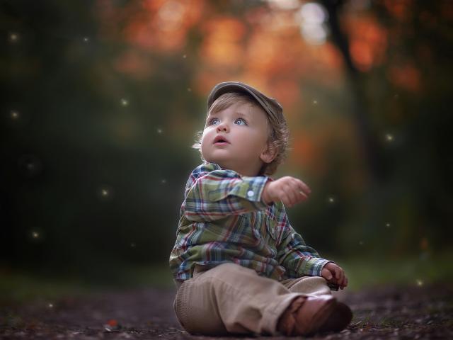 Обои Маленький милый мальчик сидит в кепке на дороге