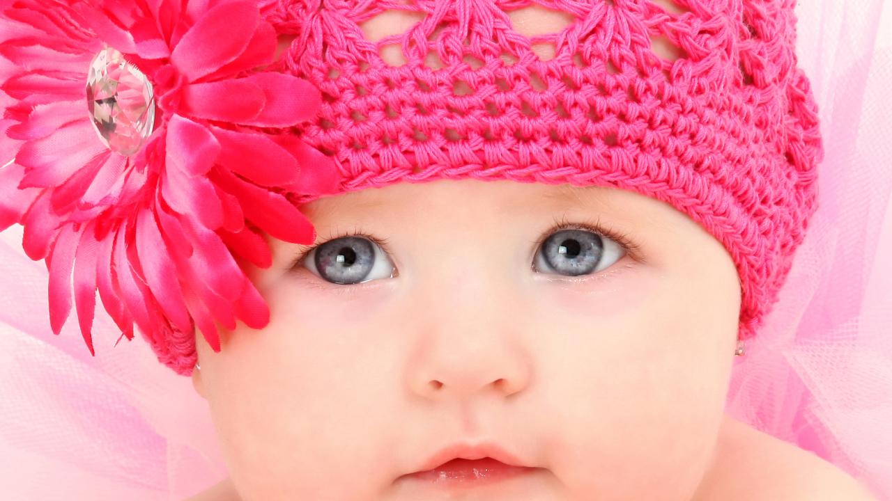 Обои Грудная голубоглазая девочка в розовой шапке на белом фоне