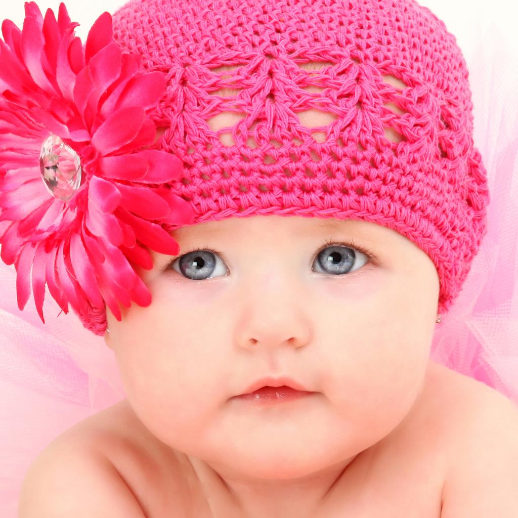 Обои Грудная голубоглазая девочка в розовой шапке на белом фоне