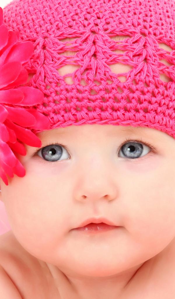 Обои Грудная голубоглазая девочка в розовой шапке на белом фоне