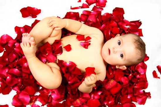 Обои Милый грудной ребенок лежит на лепестках розы на белом фоне