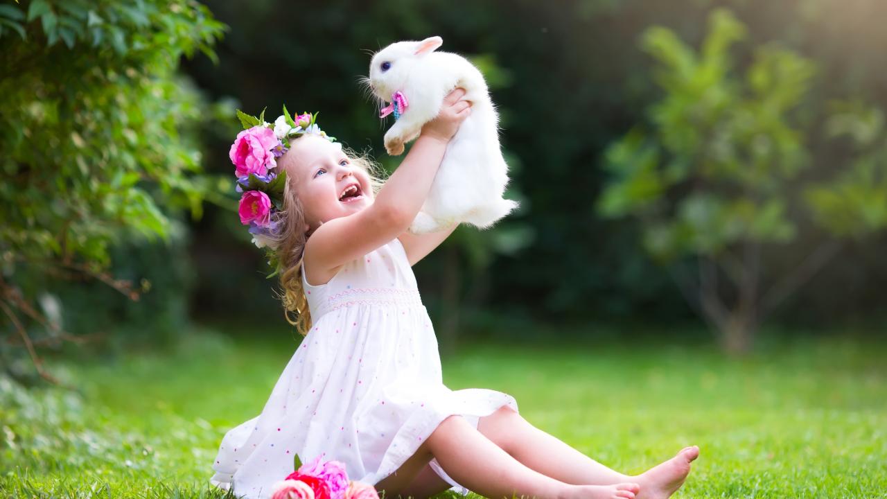 Обои Радостная маленькая девочка в белом платье с кроликом в руках