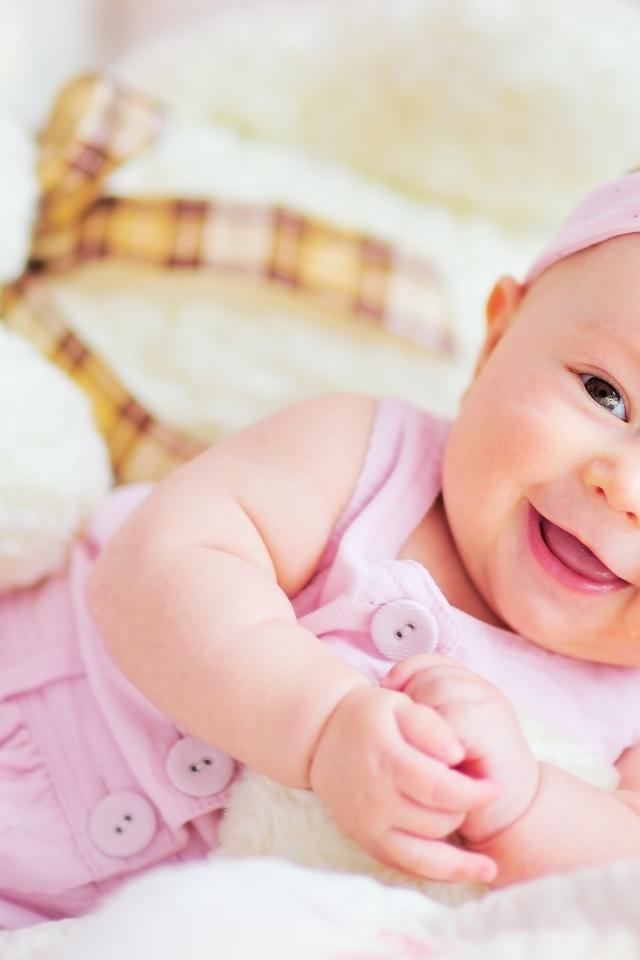Обои Улыбающаяся маленькая девочка с большим плюшевым медведем