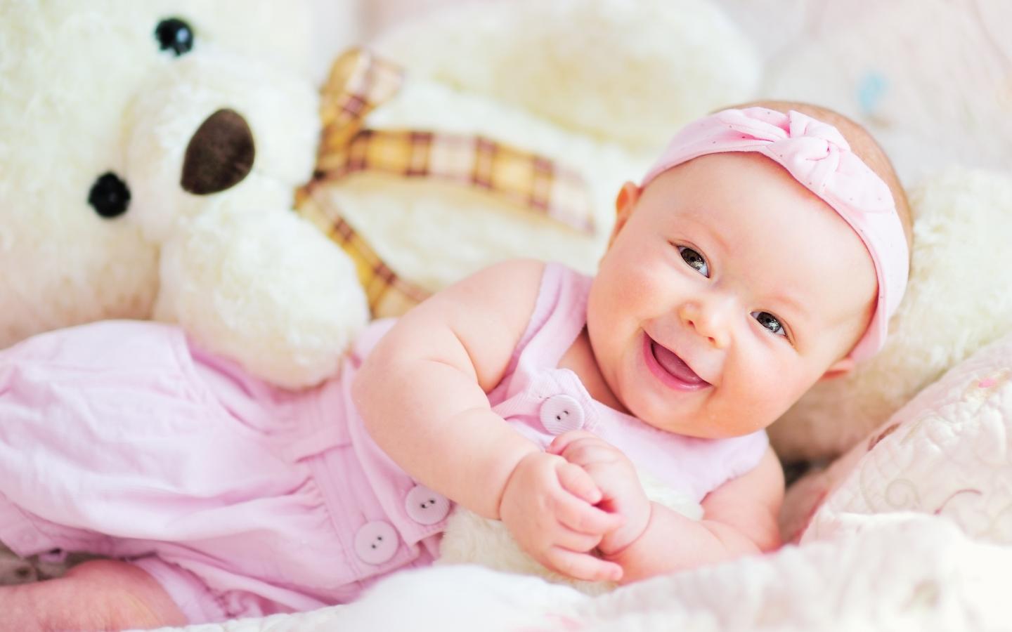 Обои Улыбающаяся маленькая девочка с большим плюшевым медведем