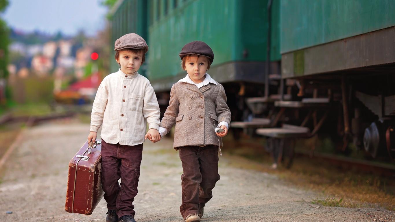 Обои Два маленьких мальчика с большим чемоданом у поезда
