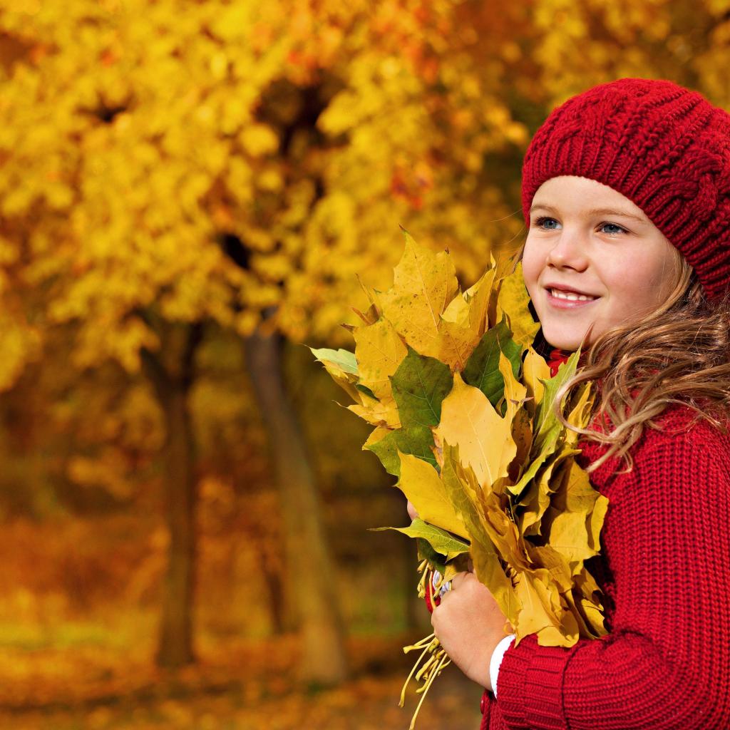 Обои Девочка в красном берете с желтыми листьями в руках
