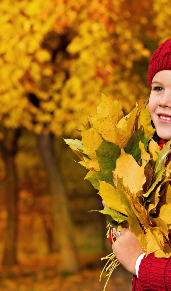 Обои Девочка в красном берете с желтыми листьями в руках
