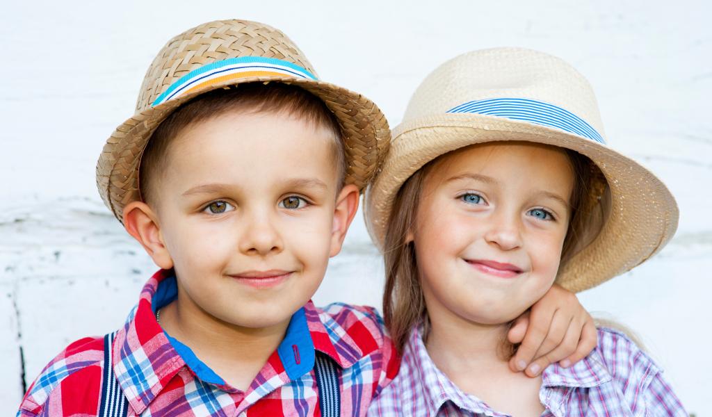 Обои Маленькие мальчик и девочка в соломенных шляпах на пляже