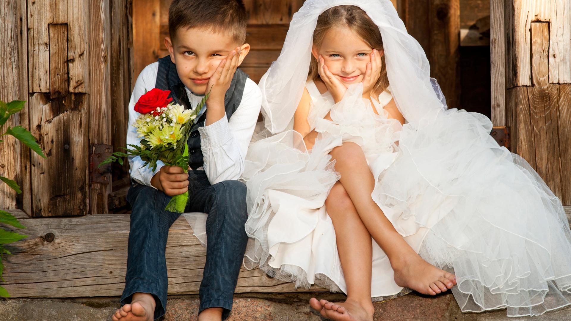 Обои Маленькие мальчик и девочка в нарядах жениха и невесты