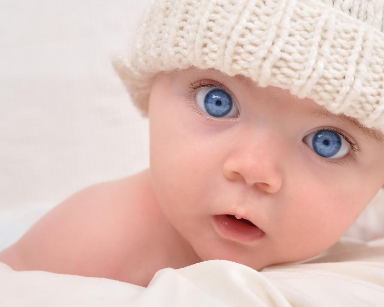 Обои Голубоглазый малыш в белой вязаной шапке на сером фоне