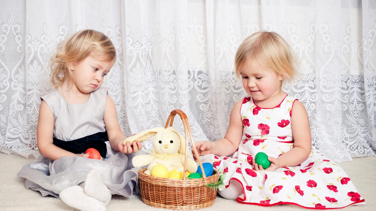 Обои Две маленькие девочки с корзиной пасхальных яиц