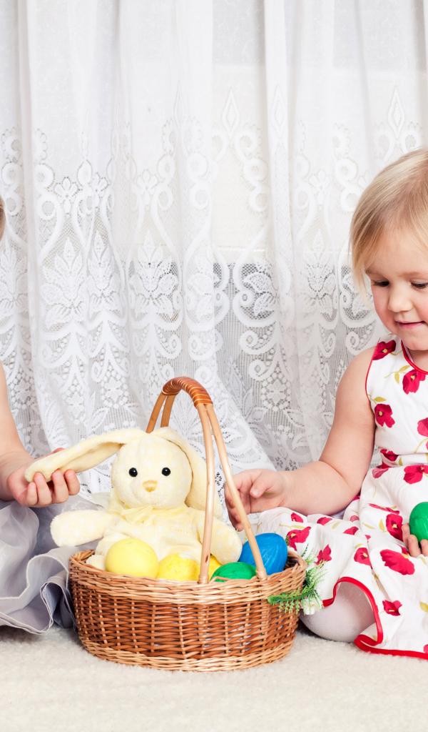 Обои Две маленькие девочки с корзиной пасхальных яиц