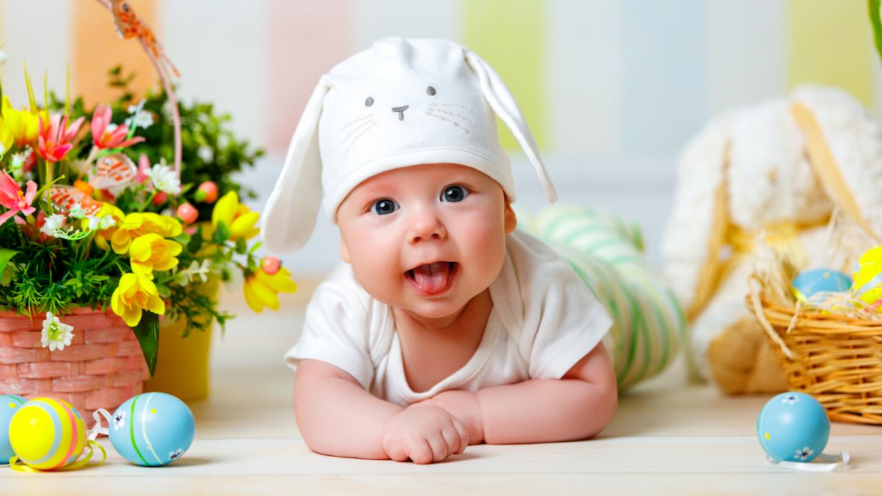 Обои Маленький ребенок с корзиной цветов и пасхальными яйцами