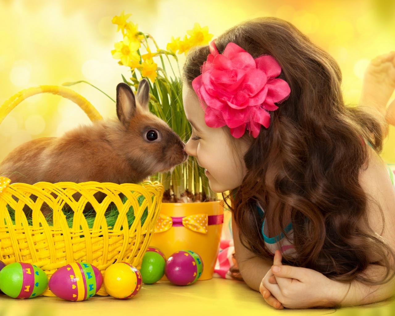 Обои Маленькая девочка с кроликом в корзине на праздник Пасха