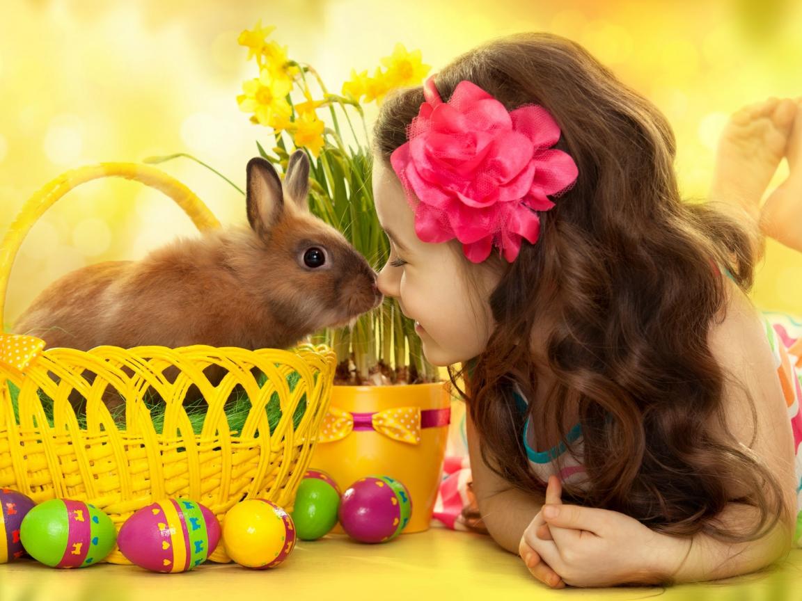 Обои Маленькая девочка с кроликом в корзине на праздник Пасха
