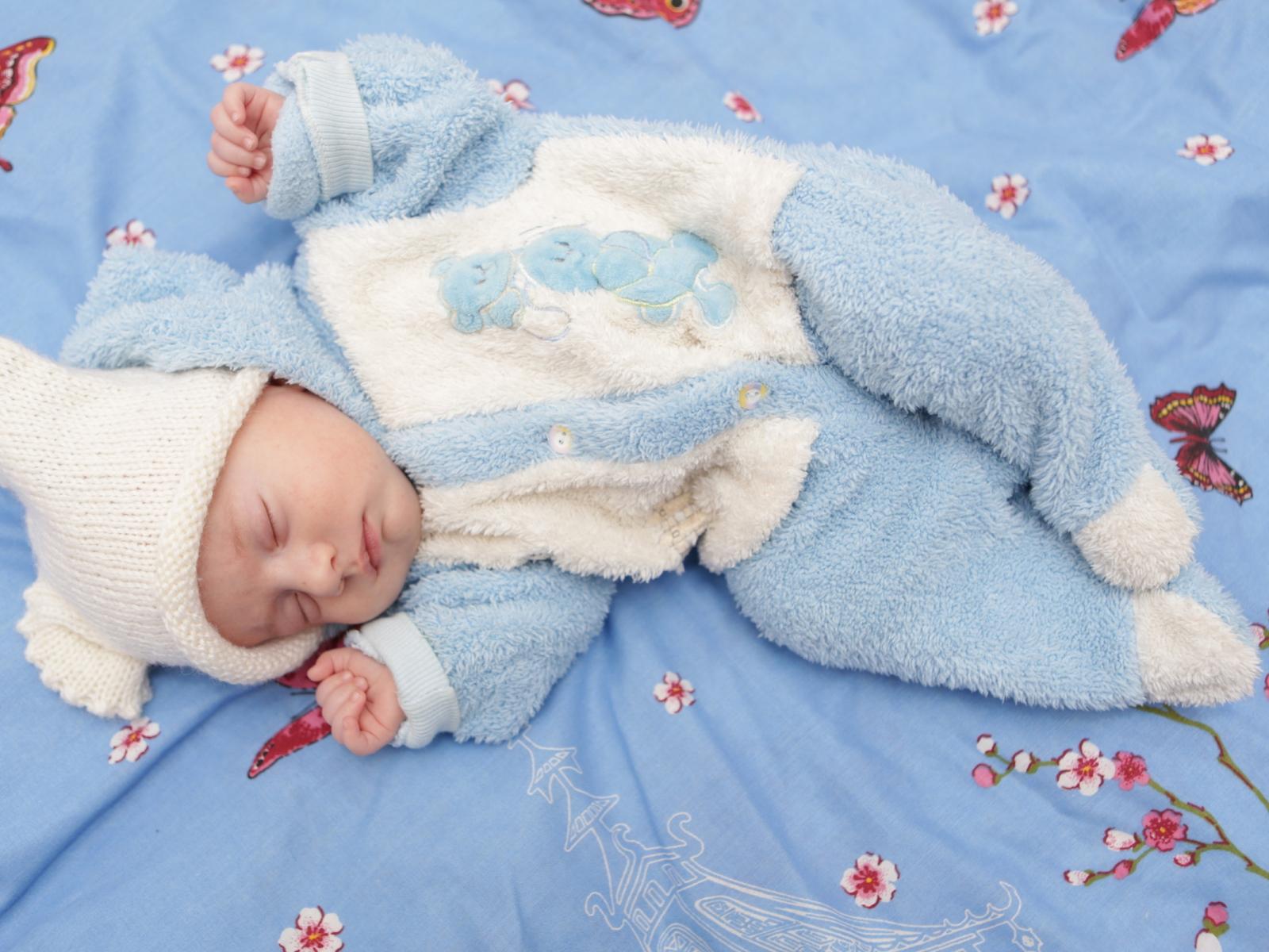 Обои Грудной спящий ребенок в голубом костюме