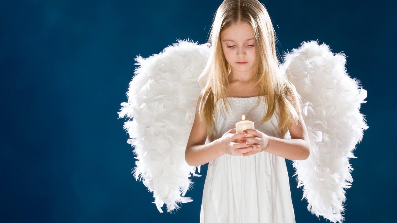 Обои Девочка с белыми крыльями ангела со свечой в руках