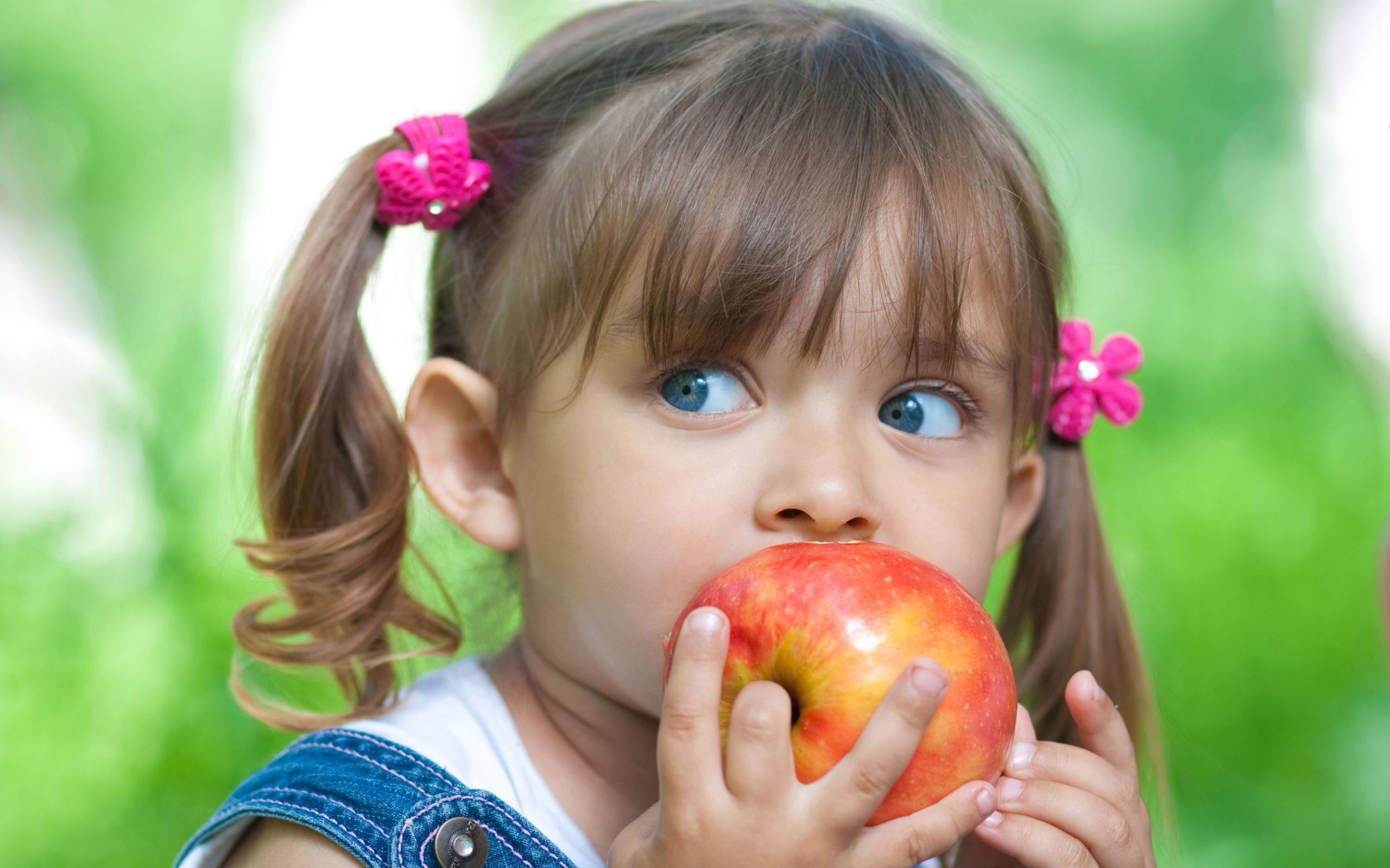 Обои Маленькая голубоглазая девочка с большим яблоком