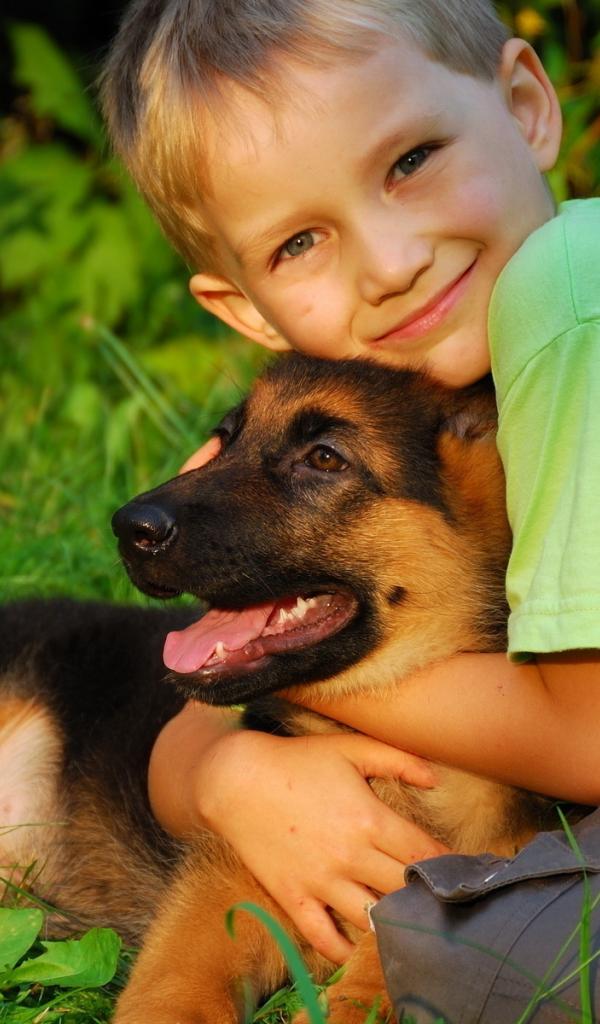 Обои Маленький мальчик обнимает щенка немецкой овчарки