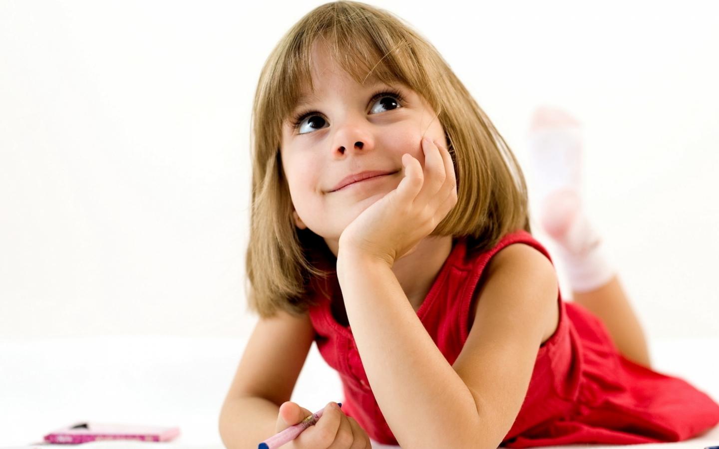 Обои Милая девочка в красном платье рисует
