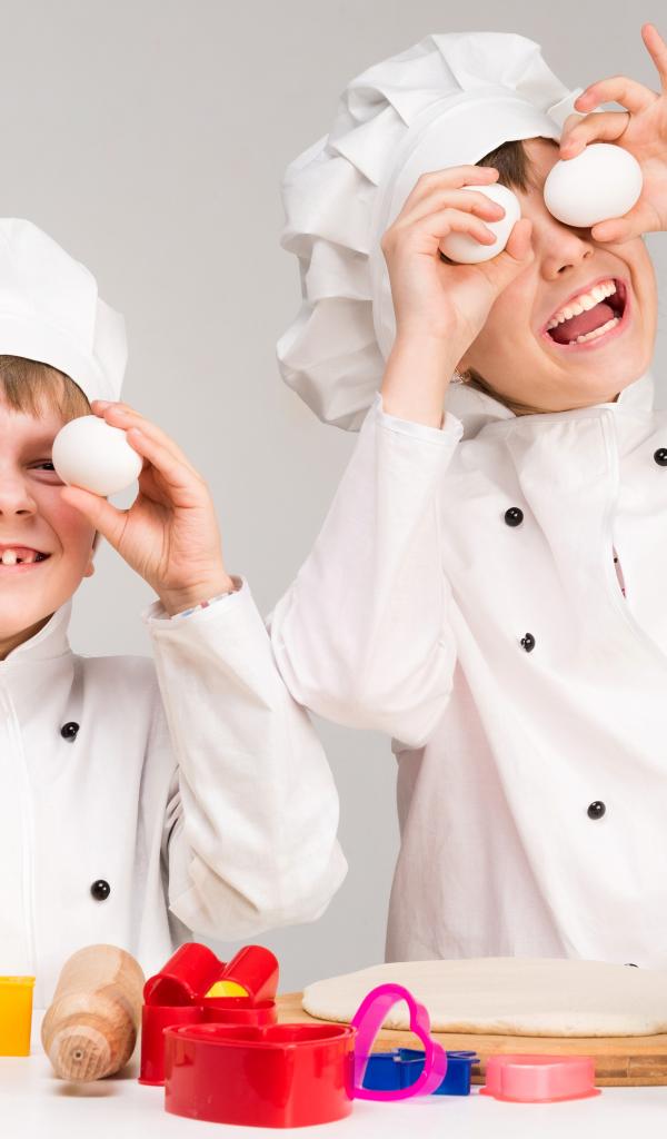 Обои Два маленьких мальчиках в костюмах повара на кухне