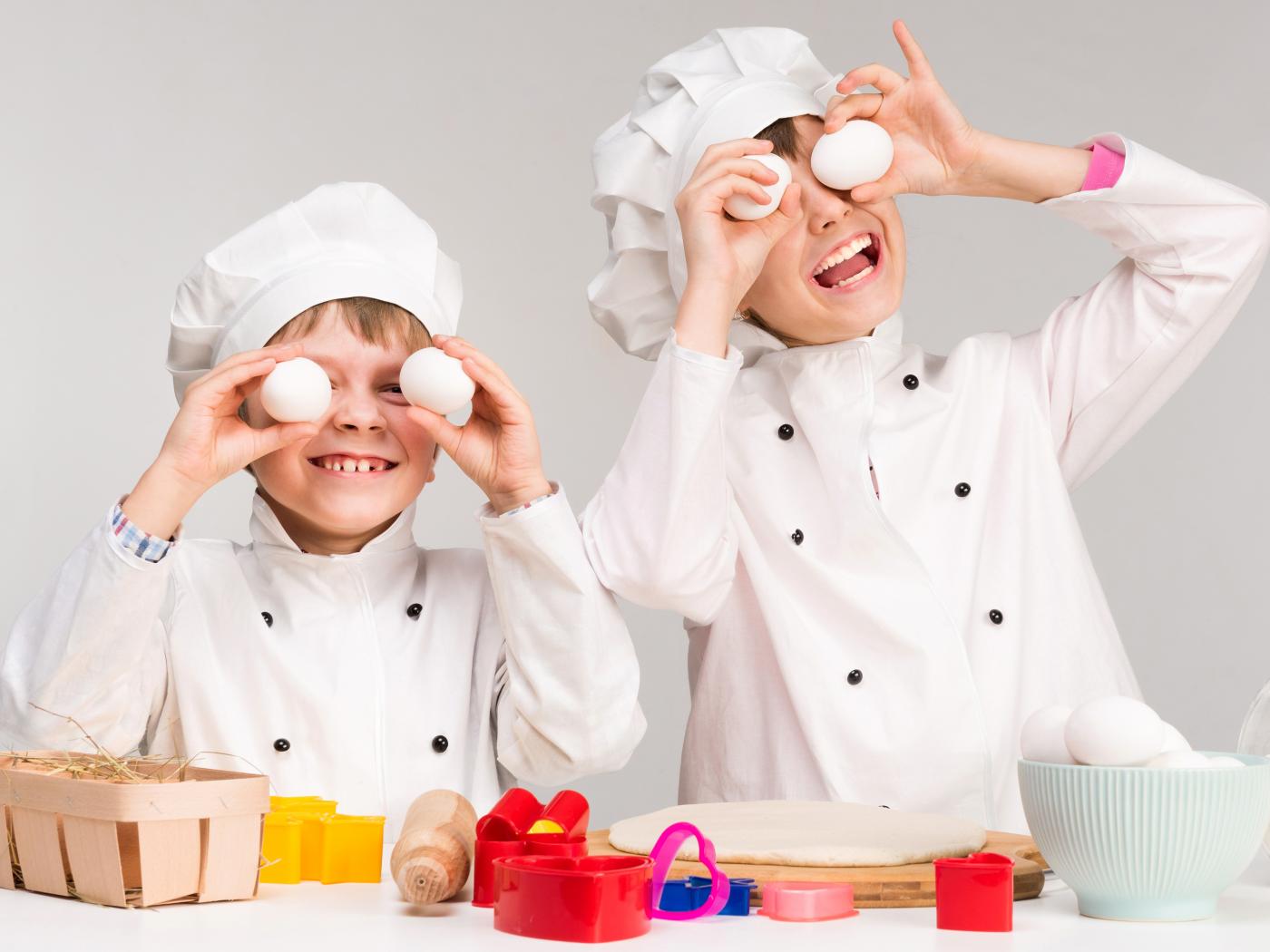 Обои Два маленьких мальчиках в костюмах повара на кухне