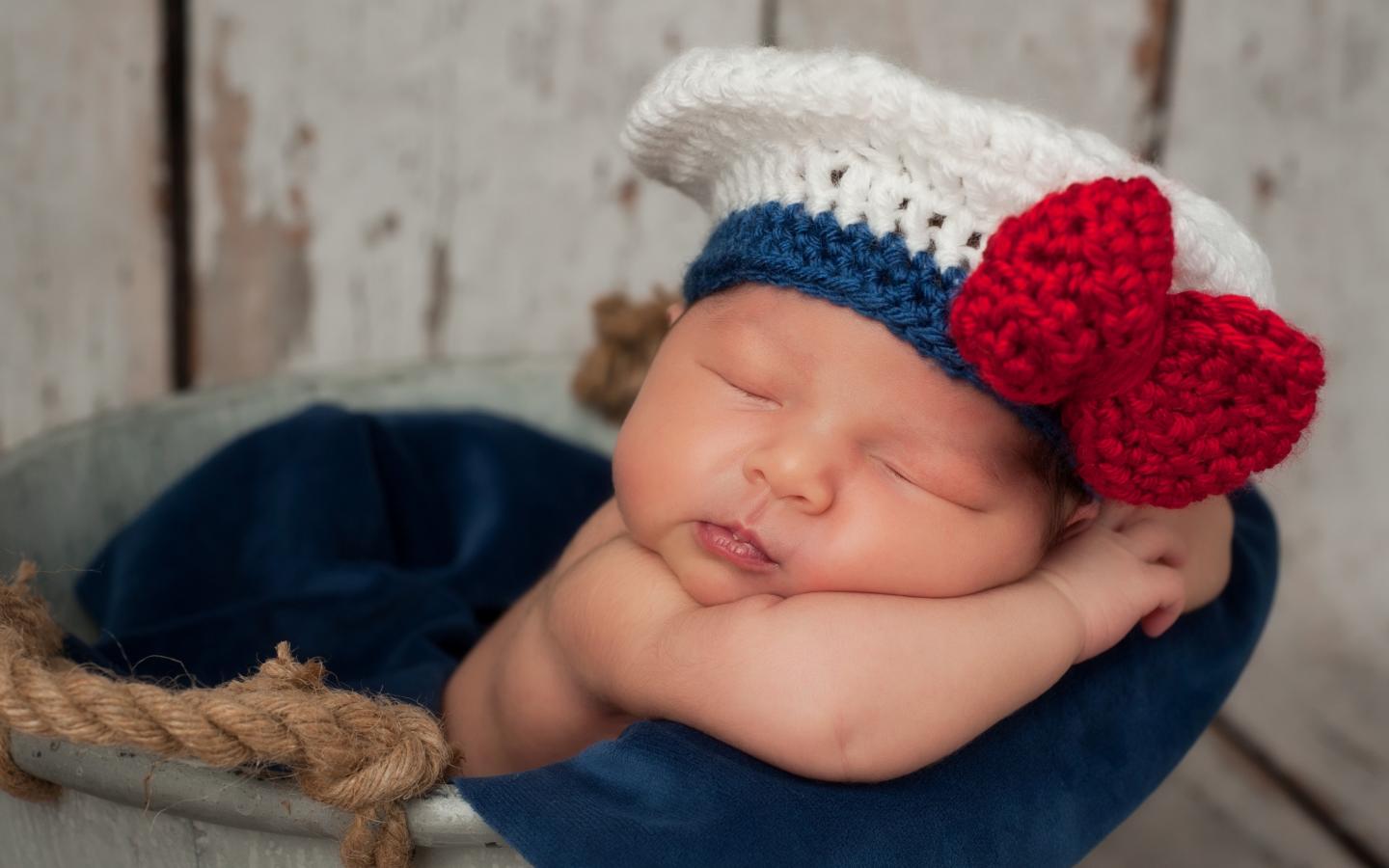 Обои Спящий грудной ребенок в вязаной шапочке с красным бантом