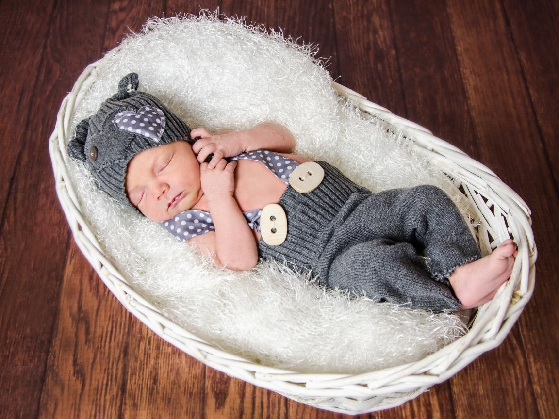 Обои Спящий младенец в сером костюме в белой корзине